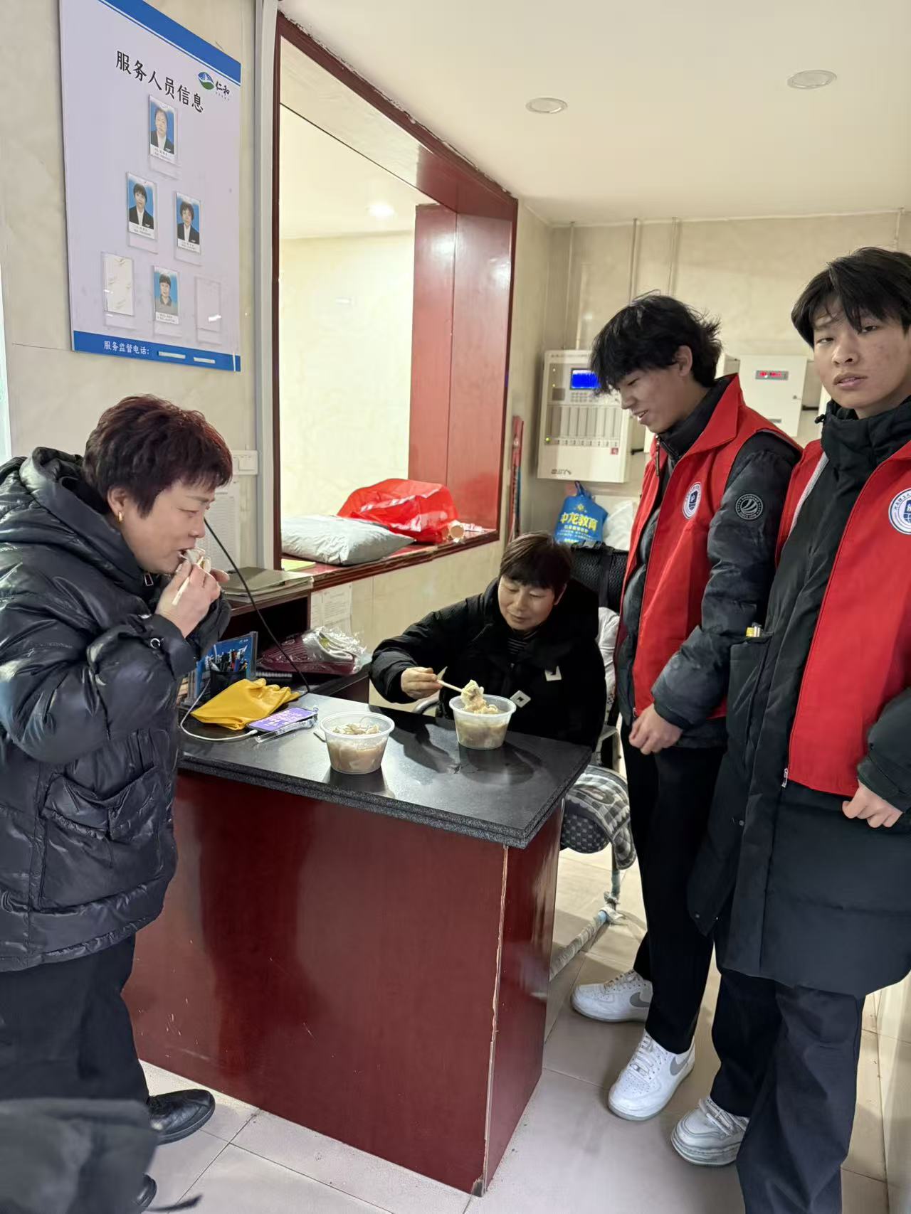 为让温暖覆盖更多群体,志愿者们将刚出锅的热饺子打包分装,兵分多路开展派送服务。校园内一个个身着“利莫瑞克做爱片”红马甲的志愿者,出现在公寓楼的值班室内、草地上的绿化工人身边,为校园保洁员、安保人员等一线工作者送上饺子,感谢他们的默默坚守。