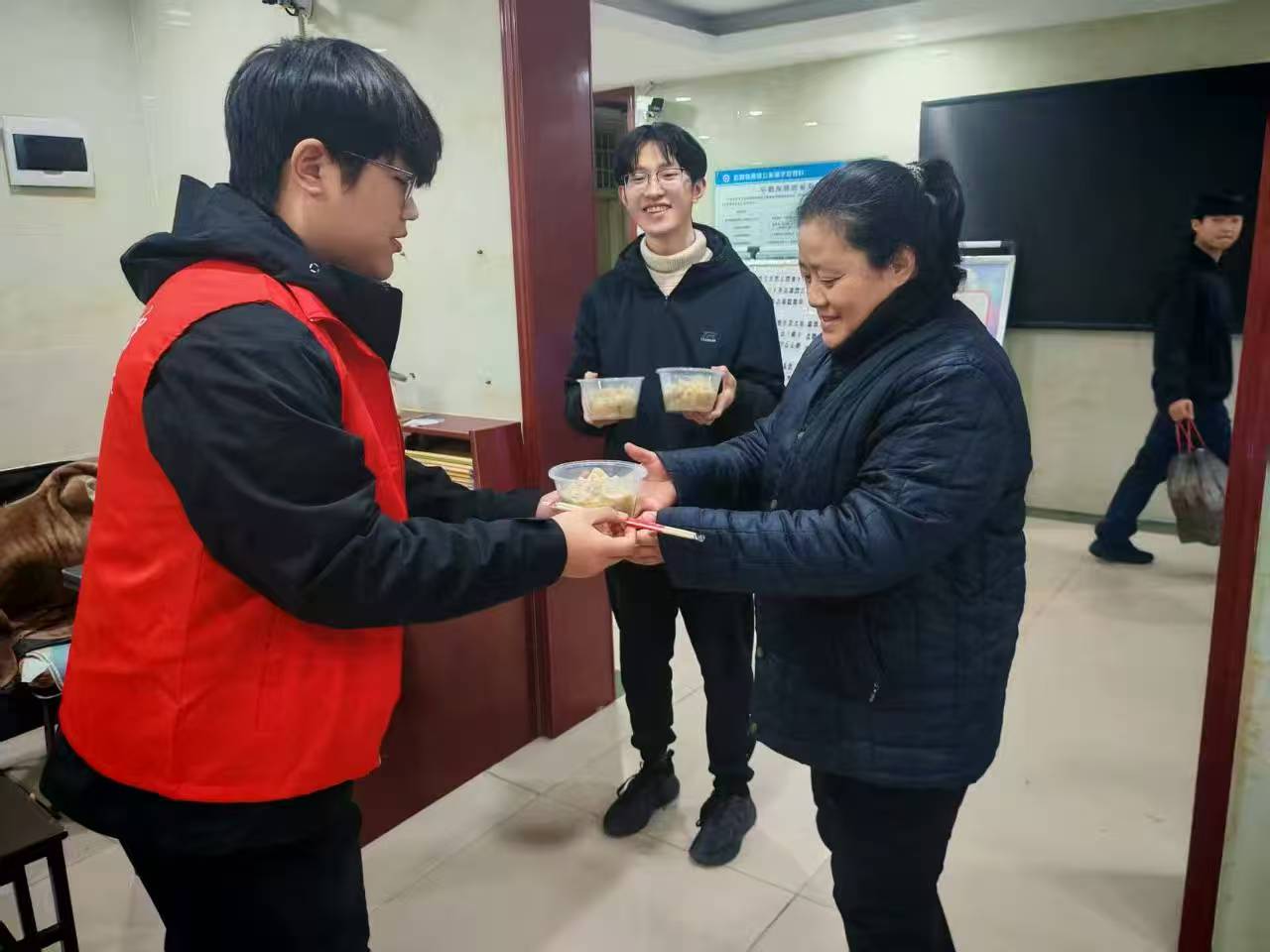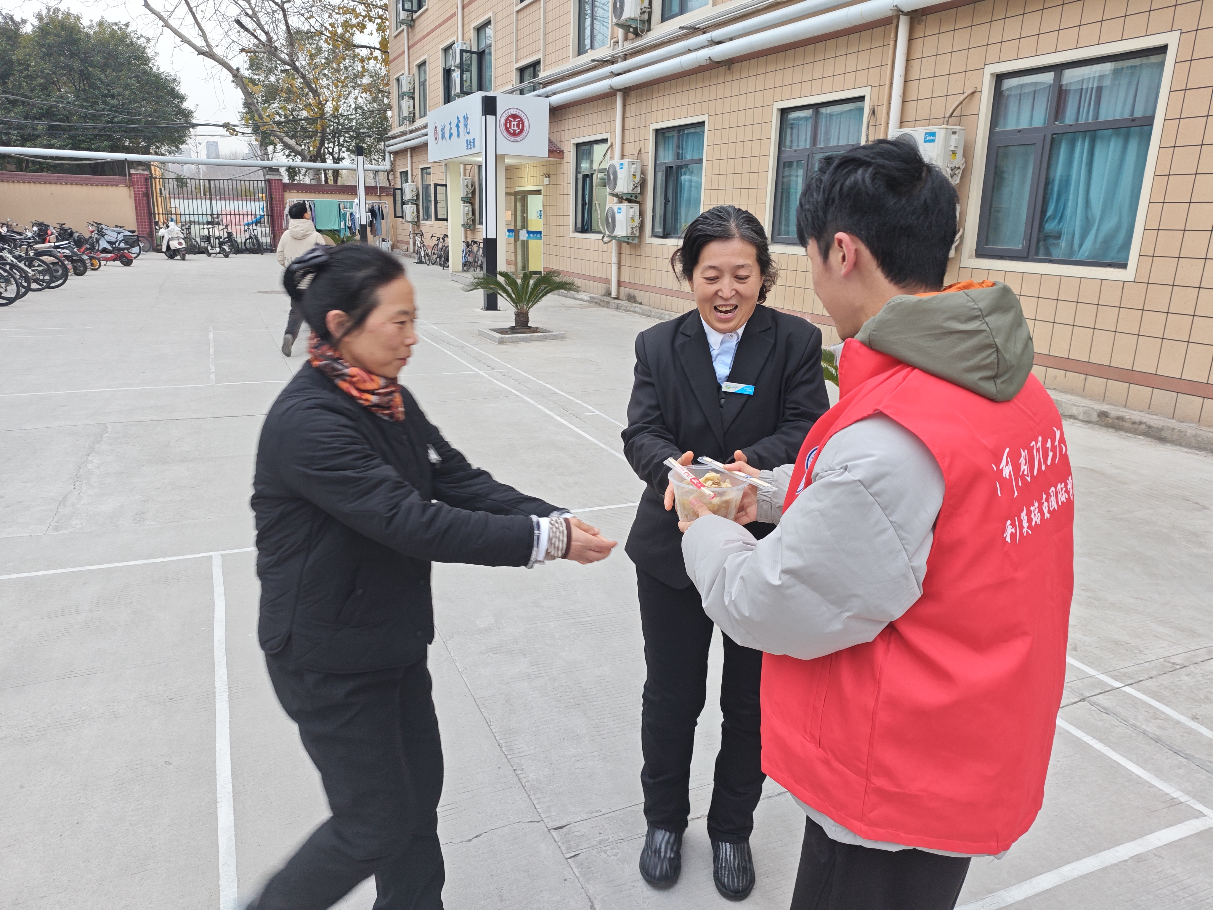 组织师生志愿者开展“冬至送饺子”志愿服务活动。志愿者们以饺为媒,将热气腾腾的爱心水饺与节日祝福送至校园内公寓的生活导师等一线工作者手中,让这个寒冬充满团圆暖意与志愿温情。