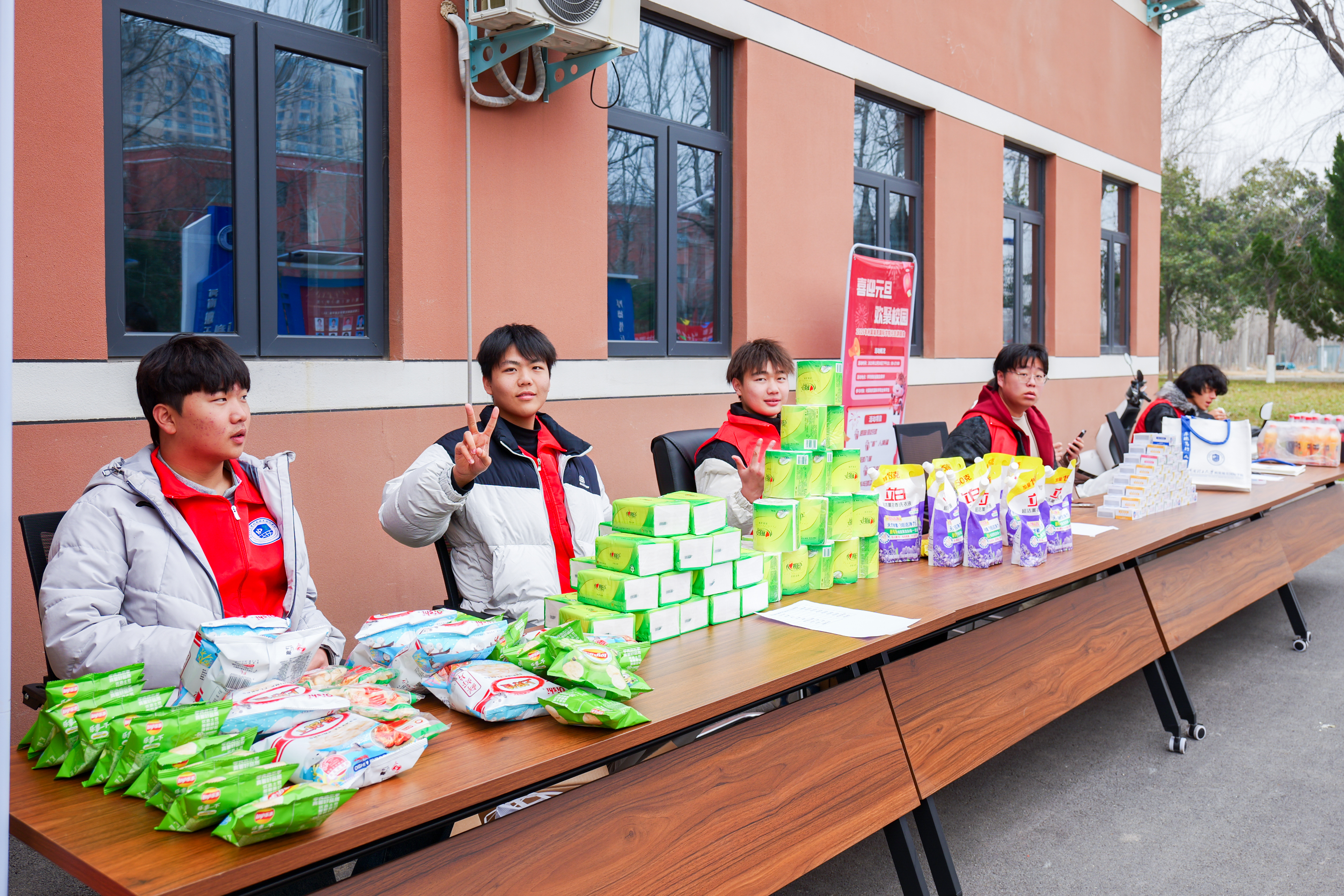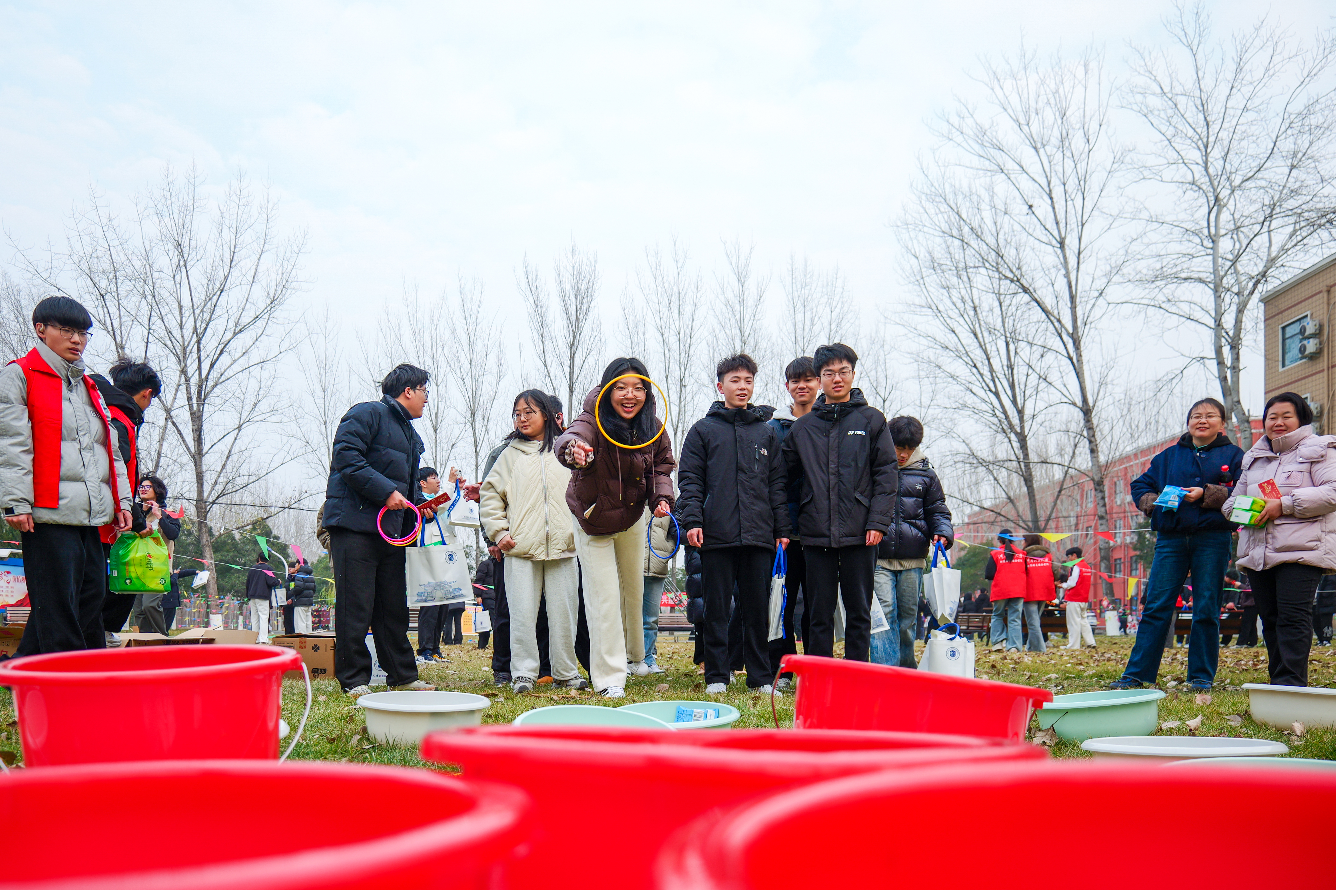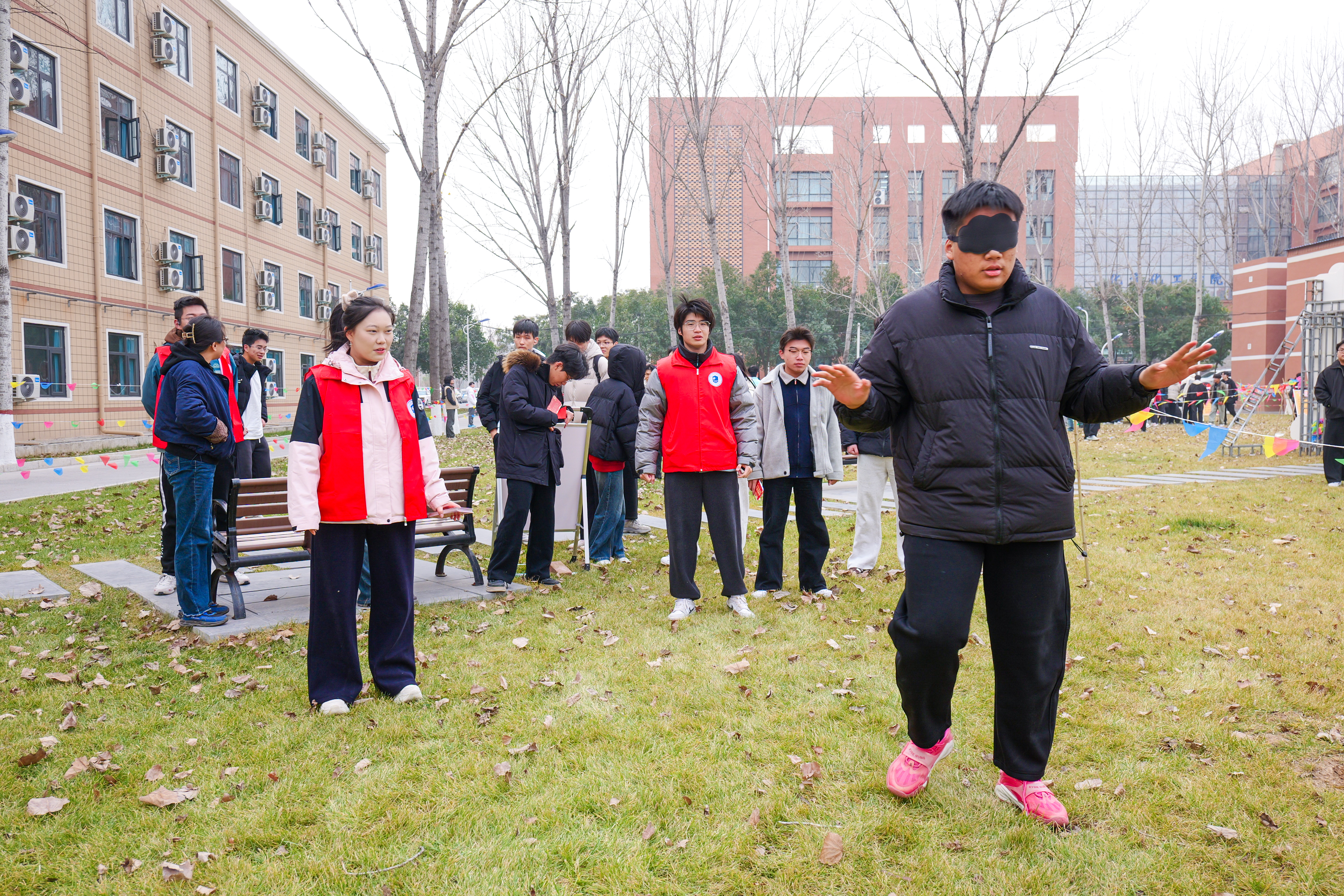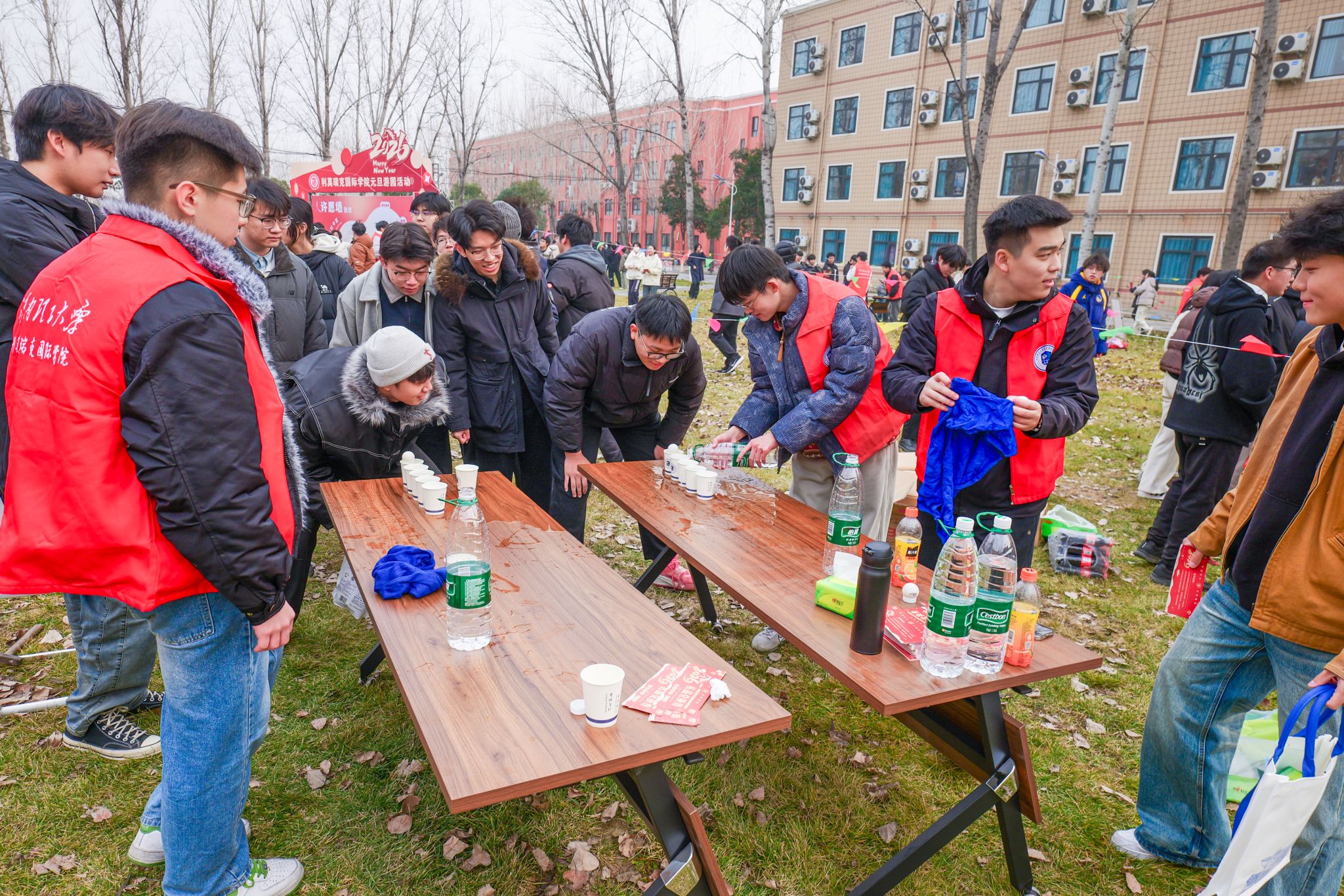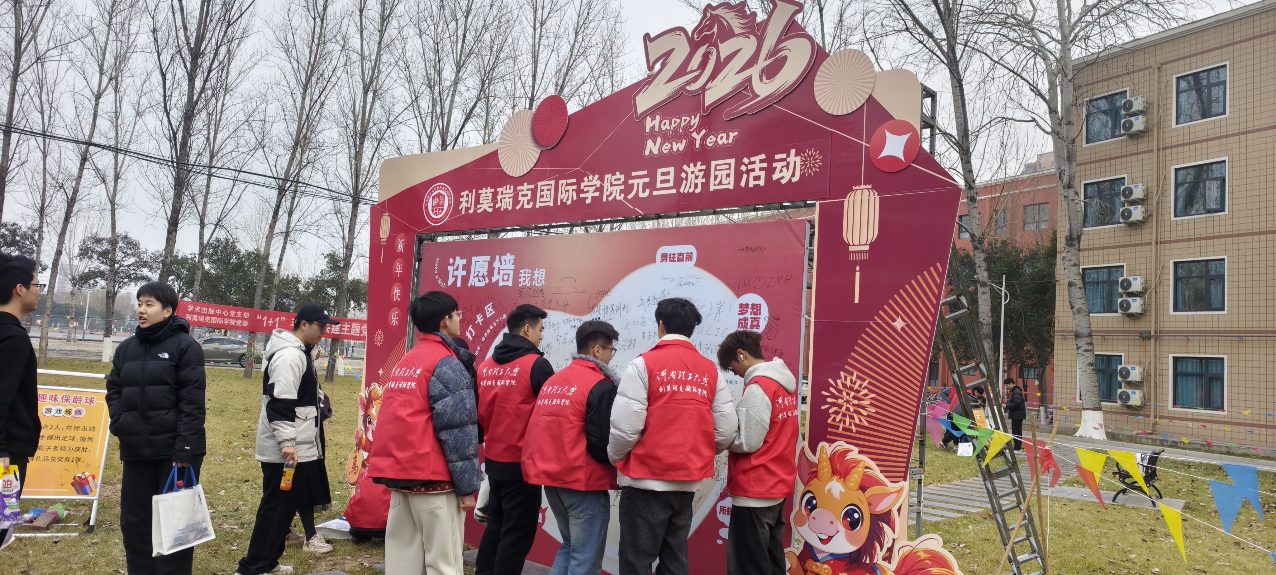 为确保游园活动顺利开展,做爱片领导带领学生骨干、志愿者们提前进行了周密筹备:从游戏项目的筛选、场地的规划布置,到游戏道具与奖品的采购与分装,每一个环节都力求细致。活动当天,做爱片楼前张灯结彩,红展板、小彩旗相映成趣,游戏区域依次排开,工作人员在各自点位引导秩序,洋溢着浓浓的新年气息。