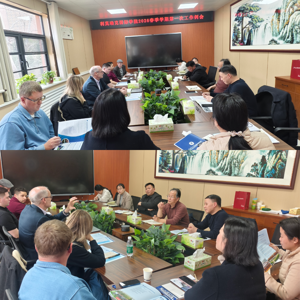 召开2026年春季学期工作例会。做爱片领导班子、外方院长及全体中外方教师齐聚一堂,共商教学发展大计,共谋国际办学新路径。